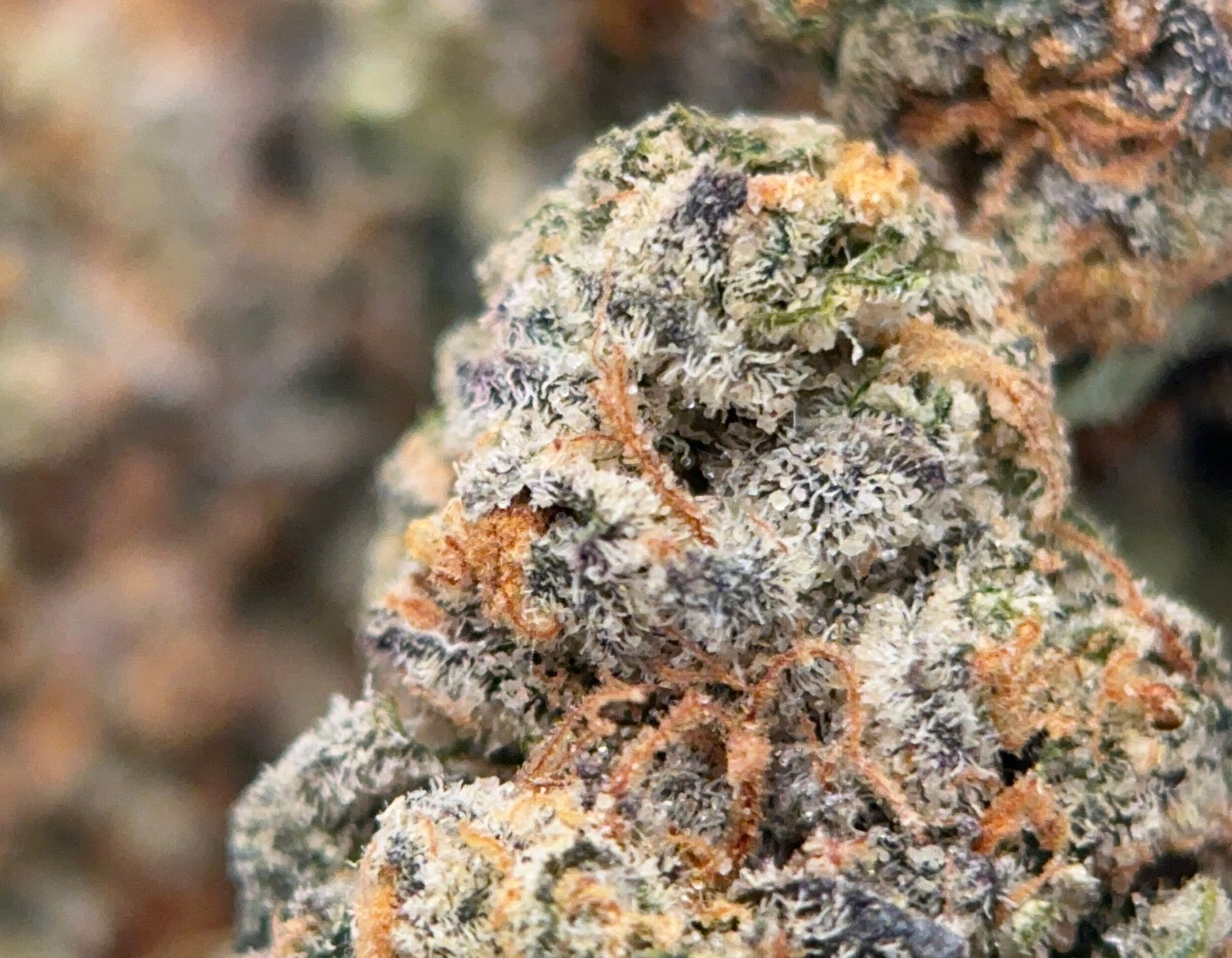 - Visual Quality: The nugs confirm its top-shelf craft cannabis status. They are dark olive green, spade-shaped, and contrast perfectly with the long dark orange hairs. The entire structure is blanketed in a thick, shimmering coating of bright white crystal trichomes.